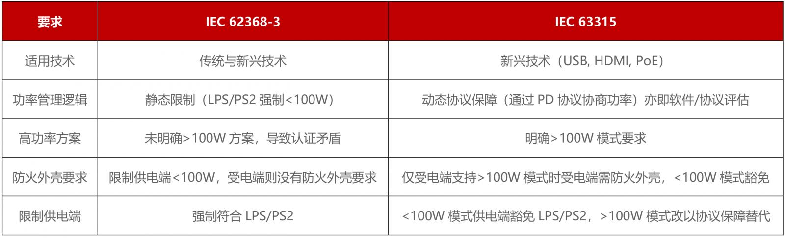 新舊技術(shù)的混合要求,本來(lái)就容易造成適用范圍的混亂。加之新技術(shù)的快速發(fā)展,如USB PD 3.1功率突破引發(fā)標準失效,即當USB PD 3.1支持EPR(Extended Power Range)模式,功率提升至240W(48V)后,傳統LPS/PS2(限功率源)要求(<100W)不再適用。IEC 62368-3無(wú)法解決高功率下的安全矛盾,例如防火外殼要求與協(xié)議管理的脫節。