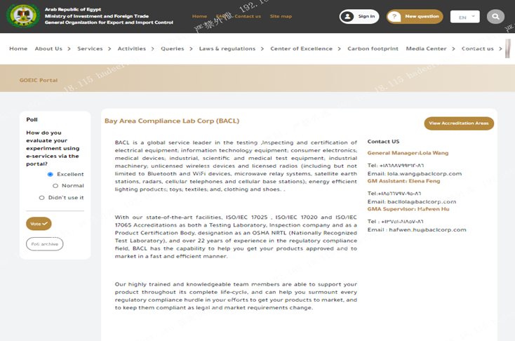 BACL是全球知名的GOEIC/ILAC及NTRA發(fā)證機構,也是NTRA在中國認可的4個(gè)實(shí)驗室之一,提供測試、發(fā)證和驗貨服務(wù)。BACL在埃及NTRA及GOEIC/ILAC的測試、發(fā)證及驗貨上有多年經(jīng)驗,可幫助您順利獲得證書(shū)出口貨物到埃及。