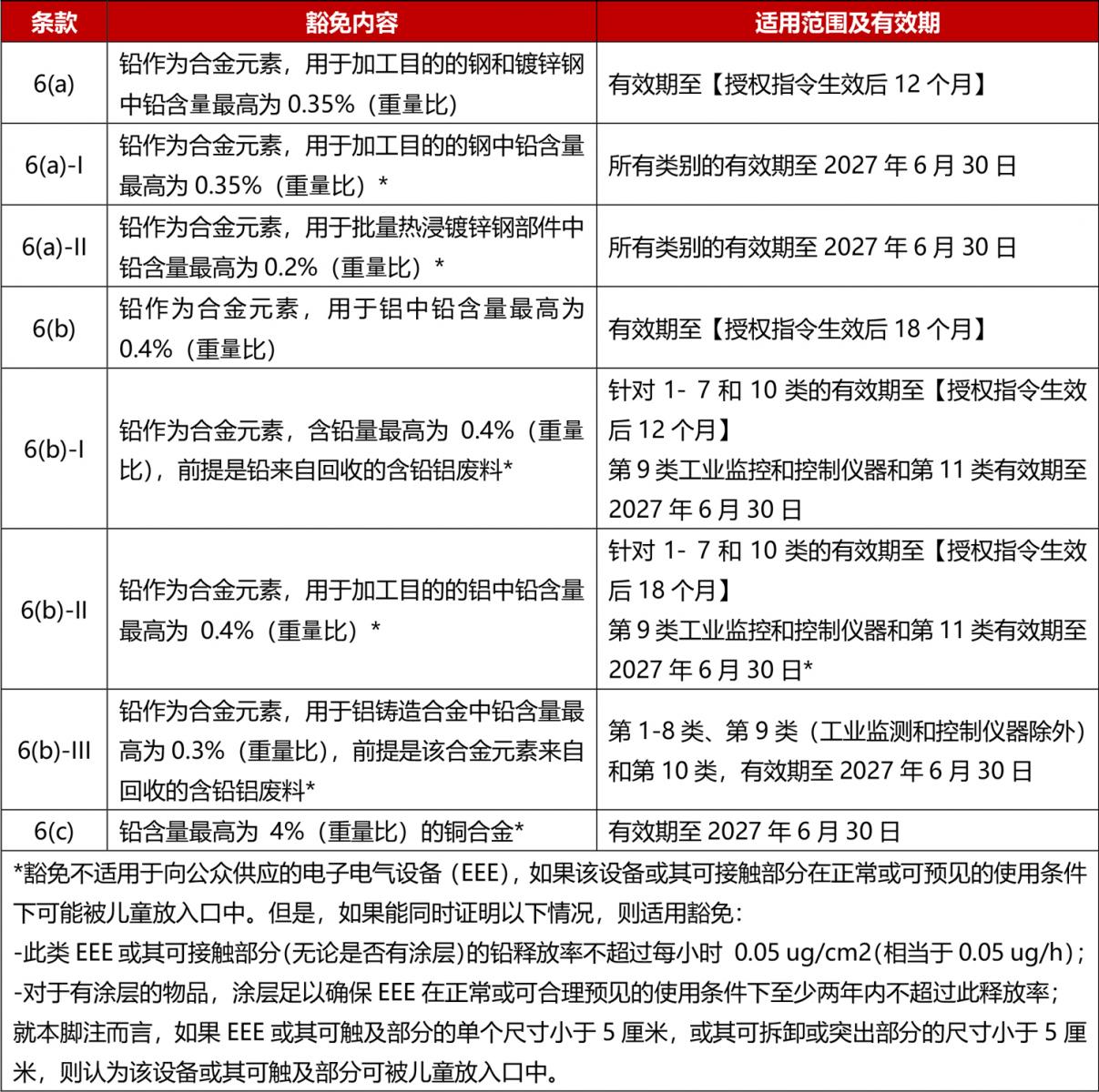 關(guān)于鋼合金、鋁合金和銅合金,RoHS指令附錄III的6(a), 6(a)-I, 6(b), 6(b)-I, 6(b)-II 和 6(c) 條款被替換為以下內容: