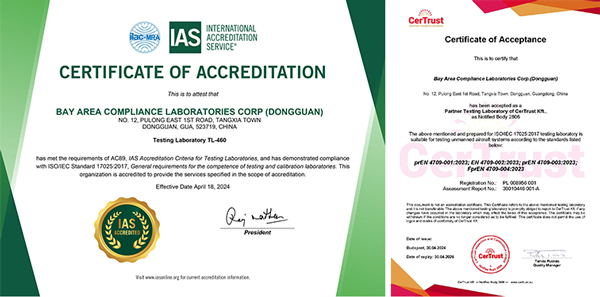 BACL無(wú)人機測試實(shí)驗室已獲得了美國認可機構IAS的ISO17025認可及歐盟NB機構CerTrust的認可。